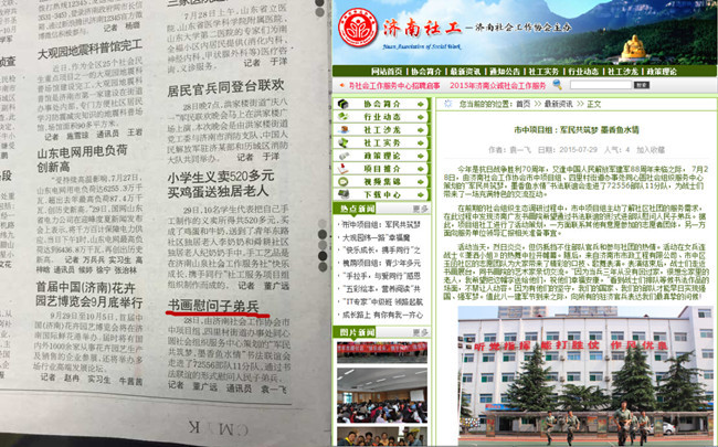 紀念抗日戰爭勝利70周年暨中國人民解放軍建軍88周年來臨之際,濟南市市政工程有限公司團委的青年志愿者們與市中區社工組織一起來到軍區某部隊開展了一次“擁軍慶祝進軍營揮毫潑墨獻深情”的曲藝、書法交流慰問活動。