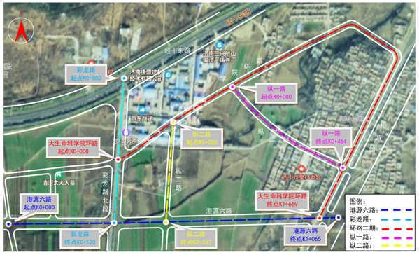本項目建設單位為濟南高新技術產業開發區管理委員會財政性投資項目推進中心,工程位于濟南市高新區,主要有港源六路、彩龍路、大生命科學院環路二期、縱一路、縱二路5條道路,道路總長3784米,施工內容為道路、排水、管線綜合、電力管溝、照明工程、交通設施工程、綠化工程和橋(涵)工程等,計劃工期540日歷天。