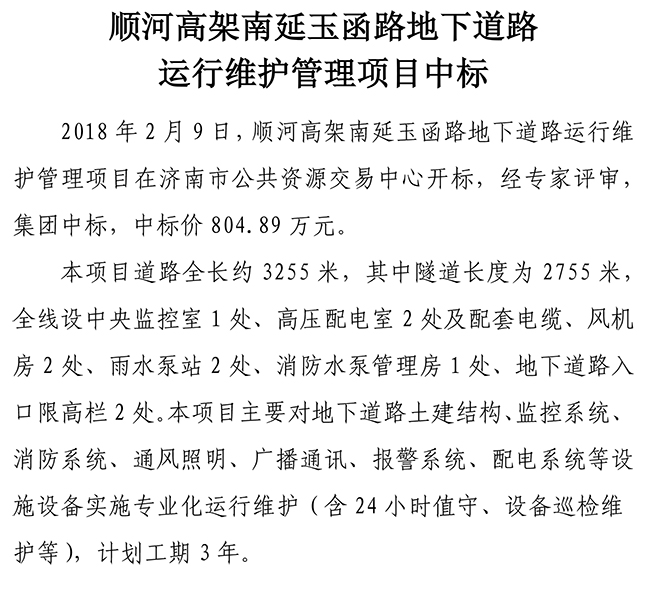 順河高架南延玉函路地下道路 運(yùn)行維護(hù)管理項目中標(biāo)